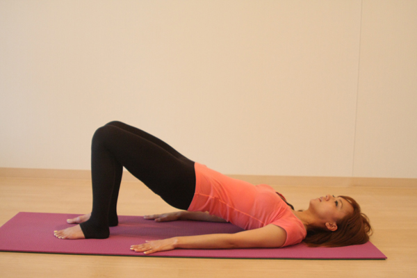 1.恥骨から一つずつ背骨をマットからはがすようにして肩から膝まで体を一直線に持ち上げた後、