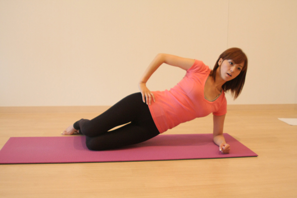 1.横向きになり膝を曲げる。肘と骨盤と膝を直線ラインにおく。