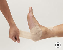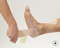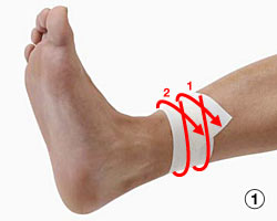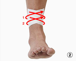 テーピングの構成の基礎となる部分。1本目は、内側のくるぶしからひと握りのところに脚のカーブに沿って強く巻きます。2本目は、1本目の強さに合わせてテープの3分の1が重なるように巻きます。締めすぎに注意!