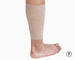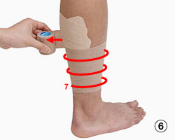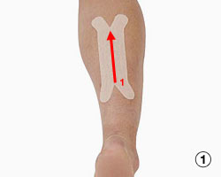 クロスさせて下から上へと交互に貼ります。ふくらはぎの上部へ向かって、最初のテープが覆われる程度に貼ります。下から上に貼るのは、末梢から血液を押し上げる意味があります。圧迫するには、下から上に引っ張り上げる方が良いのです。