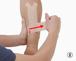 1本目同様、2本目¥のテープも最初は1㎝ほど浮かせます。くるぶしの真下からかかとを通して、外側を真っすぐ引っ張りながら貼ります。