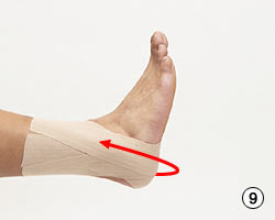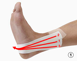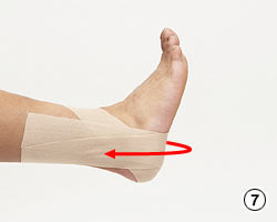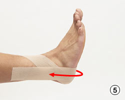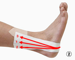 内反を防止する役割を持ちます。アンカーの内側からかかとの下を通って外側へ巻いていきます。2本目、3本目はかかとの下で1本目とクロスするように巻いてください。完成時は3本のテープは扇形になります。