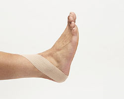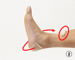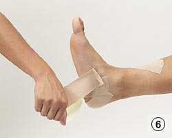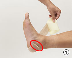 足首を直角に保った状態で、内くるぶしからかかとにかけてテープを貼ります。また、かぶれを防止するために1㎝ほどテープを浮かせ、テープをかかとにかけて引っ張りながら、外側のくるぶしを通します。くるぶしを通過したら、斜め上方向に貼ります。