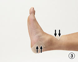 3本目は、2本目の少し上からスタートさせます。かかとに向けて斜め下方向に引っ張っり、かかとを通過させたら外側のアキレス腱側に向かって貼ります。