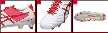 前足部に「EX-SKIN(イーエックススキン)」を採用し、柔らかな足入れを実現。相手に負けない“球際”での強さを実現するため、母趾球部下に3本の小さいスタッドを配置するなど『リーサルスナイパー4』と同機能を持つモデル。
