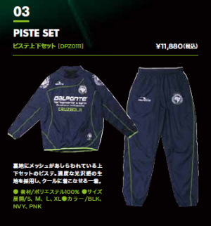 裏地にメッシュがあしらわれている上下セットのピステ。適度な光沢感の生地を採用し、クールに着こなせる一着。