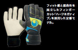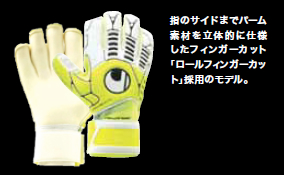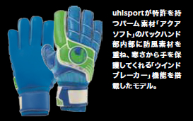 uhlsportが特許を持つパーム素材「アクアソフト」のバックハンド部内部に防風素材を重ね、寒さから手を保護してくれる「ウインドブレーカー」機能を搭載したモデル。