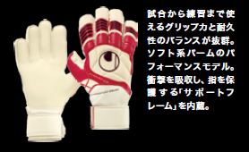 試合から練習まで使えるグリップ力と耐久性のバランスが抜群。ソフト系パームのパフォーマンスモデル。衝撃を吸収し、指を保護する「サポートフレーム」を内蔵。