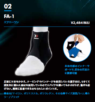 足首に不安をかかえ、テーピングやバンデージを使用している選手向け。うすくて通気性に優れた素材を採用しているのでスパイクを履いてもかさばらず、動きも妨げない。簡単に装着できるのもうれしいポイントだ。本体内部のインナーサポートで、好みの圧迫力に調節可能。
