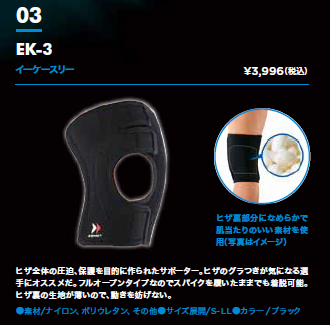 ヒザ全体の圧迫、保護を目的に作られたサポーター。ヒザのグラつきが気になる選手にオススメだ。フルオープンタイプなのでスパイクを履いたままでも着脱可能。ヒザ裏の生地が薄いので、動きを妨げない。ヒザ裏部分になめらかで肌当たりのいい素材を使用(写真はイメージ)。