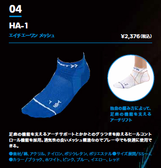 足底の機能を支えるアーチサポートとかかとのグラつきを抑えるヒールコントロール機能を採用。通気性の良いメッシュ構造なのでプレー中でも快適に使用できる。独自の編み方によって、足底の機能を支えるアーチリフト。