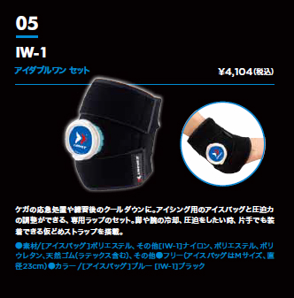 ケガの応急処置や練習後のクールダウンに。アイシング用のアイスバッグと圧迫力の調整ができる、専用ラップのセット。脚や腕の冷却、圧迫をしたい時、片手でも装着できる仮どめストラップを搭載。