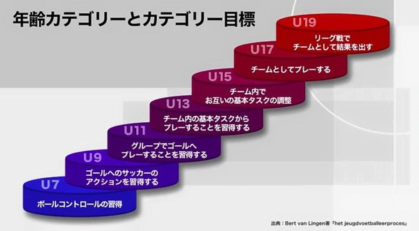 「チーム内でお互いの基本タスクの調整をする」ことが15歳のサッカー選手の目標になります。この表を見てもらえばわかるとおり、オランダでは徐々に段階を踏みながら個人からグループ、そしてチームでプレーすることを学んでいきます。U-13まででチームの中ですべきこと、自分の役割を学んだ選手たちは、15歳になるとチームの中でのお互いの役割を調整することを目標にしてプレーします。