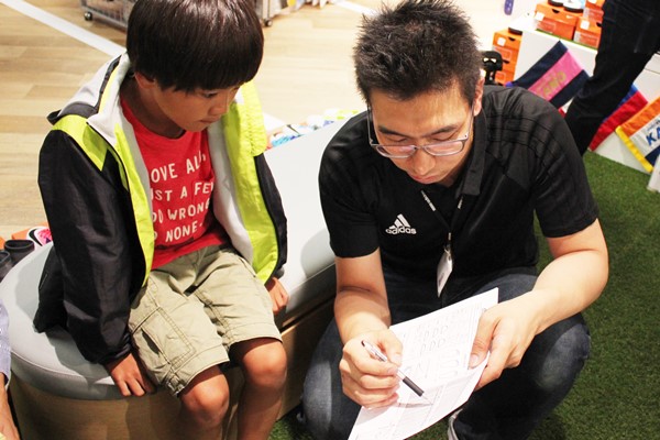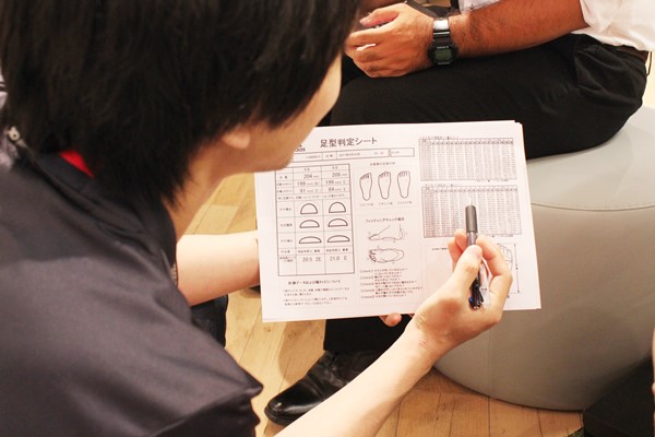 この日は、サカイク読者限定プレゼントとして実施した『アディダスのスパイクをカスタマイズできる権利』の当選者が来店し、お子さんの足の悩み相談と適切なシューズ選びを体験しました。