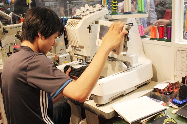 工房では、名前の文字(アルファベット)や入れる数字、色とフォントを確認して専用のミシンで1文字1文字刺繍をします。すべての文字を刺繍した後は、上野さんら人の手で糸の処理や、刺繍の表面を叩いて平らにする処理が施され、「自分だけの1足」が完成します。
