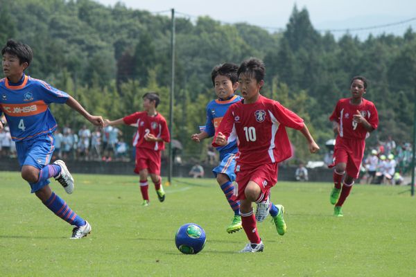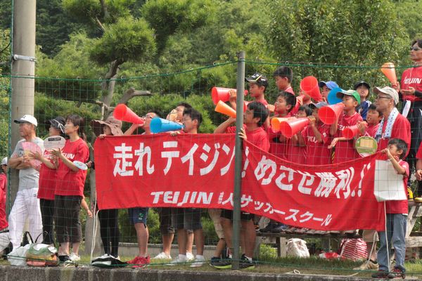 統率の取れた応援で、保護者の皆さんからは大きな声が出ていました。この大会には登録されなかったチームメイトの子どもたちもたくさん来ていて、応援を子どもたちがリードする場面がありました。高校サッカーや、地元愛媛FCの応援を真似したり、初日の対戦相手だったベガルタ仙台の応援も採り入れて応援していました。良いプレーには「ナイス!サンキュー!」の声が上がりました。厳しい暑さの中の後半飲水タイムでは「粘れ!」と残り10分の頑張りを促す声もありました。