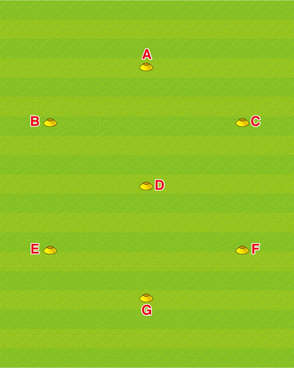 まずは選手を2列作り、A→C→D→F→Gという順番でジグザグにドリブルするチームと、G→E→D→B→Aとドリブルするチームに分けます。これを往復しながら、シザーズを入れたり、インサイドターンを入れたり、さまざまな動きを入れながら反復していきます。そして徐々に対人練習、ミニゲームと、段階的に実戦に近づいていくようにステップアップします。