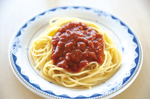 中村選手がホームでの試合前に食べるミートソースパスタ。試合前のエネルギー補給のためにチーム全体で炭水化物を摂ることになっているそう。