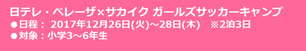 冬休みに行うサカイクキャンプは『通常キャンプ』と昨年も行った『日テレ・ベレーザ×サカイク ガールズサッカーキャンプ』を開催します!この機会に、以前ご参加頂いた選手はもちろん、初めて参加の選手も大歓迎!皆様のお申し込みお待ちしております!!※今回は小学1~3年生対象のチャレンジキャンプは開催いたしません。次回の春キャンプにて予定しております。予めご了承ください。