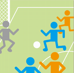 この絵では、プレーをしている自分の近くに敵が2人、そして手前には味方が1人。場所はゴールの直前で、シュートチャンスです。このようにできるだけ細かくイメージしておくことで、予行演習にもなり、新たなアイデアを生む準備にもなります