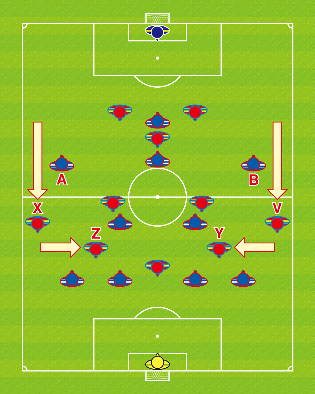 ユーロ2012のスペインA代表と同じように、サイドバックXやVが高い位置を取り、両ウイングZやYが中央へ寄って中央に厚みを作ります。ピッチの横幅を広く使った攻撃です。相手のディフェンスは、外側の選手ばかりに気を取られていると、中央の守備のすき間が大きくなり、中央突破を許す危険が増します。