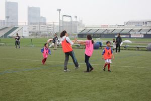 まずはお母さんと子どもが手をつなぎながらのドリブル。ボールがあらぬ方向に行ってしまっても手を離してはいけません。続いて、走りながら手を使ってのパス。相手が取りやすいところへのパス出しは、なかなか難しそうでした。