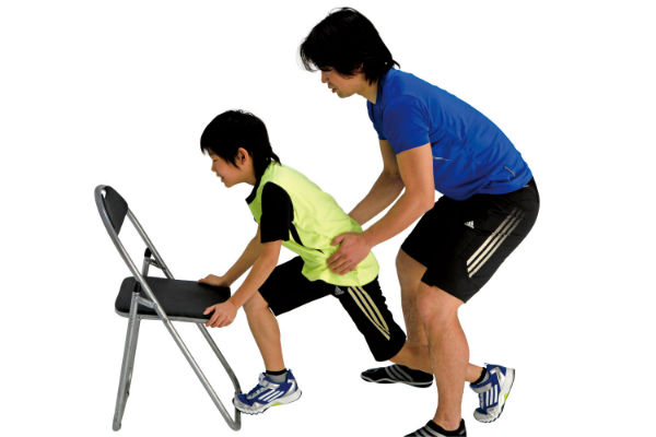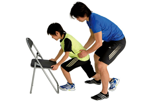 子どもはイスの端に手をつき、脚を前後に開きます。お父さんは腰に手を当ててしっかりと支えましょう
