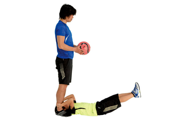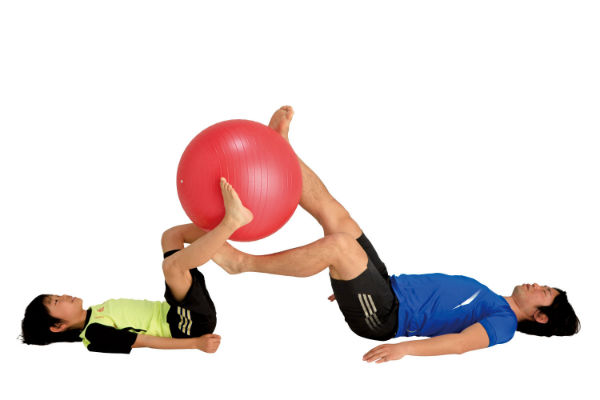脚だけを使って、床にボールを落とさないよう注意しながら、互いにパスし合いましょう。この動作を何度か繰り返します。