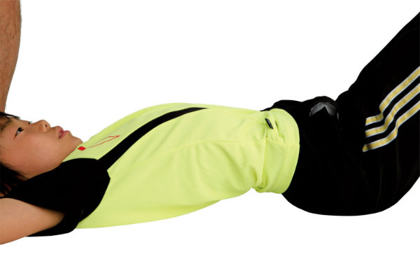 仰向けの状態でお父さんの足首を持ってもらい、両脚を浮かせてください