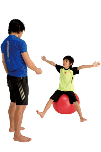 お父さんは手だけで、子どもはバランスボールの上に乗り、全身を使ってジャンケンをしましょう。グーは全身を内側に丸め込むように