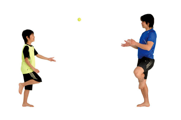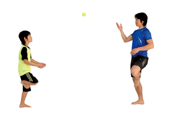 片脚立ちをしながら、キャッチボールをします。上げた方の足の裏を軸足のひざの内側にしっかり付けましょう。