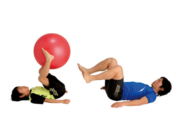 両脚でボールを蹴りに行く~脚を下げる。この動作を連続で繰り返します。また、これは逆上がりのときの脚を上に持ち上げる動作の練習の一つであり、通常の腹筋運動ではないので、反動を使っても構いません。