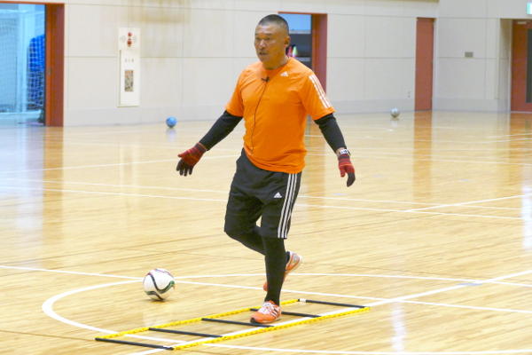 私が開発した「タニラダー」は4マスです。2mほどなので短く見えるかもしれません。しかし、トレーニングを追求するなかで「スピードアップには4マスが最適である」という結論に達しました。その理由は、実際の試合中のテンポに近づけるためです。マスが多く、長いラダーの場合、走っていく中でスピードが落ちますし、乳酸も出てきます。実際の試合では何メートルも同じ動きをしません。数メートルの短い距離を動いたり止まったり、方向を変えたり、スピードを変えたりと動きに変化が生じます。それを、4マスのラダーを使うことで再現しています。