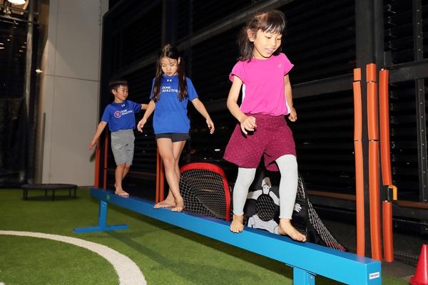 平均台を渡る子どもたち。運動ではバランスが崩れながらもコントロールできることが大事