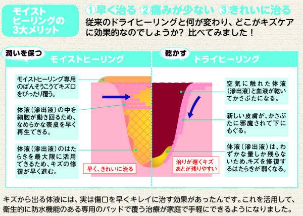 金子「無理に乾かさず、傷口から出る液体(滲出液)を利用して、痛みを少なくキズをきれいに早く治すという方法です。実は傷口から出る液体にはキズを治す力が秘められていたんです。その力を最大限に生かすために傷口を乾かさない(かさぶたをつくらない)ことがとても大切なんです」