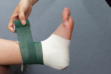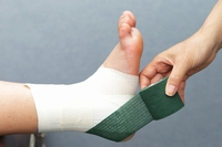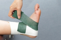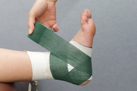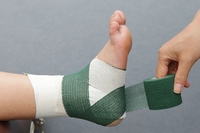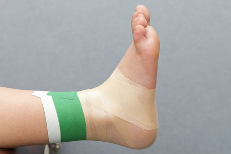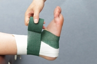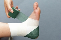 正面に戻ったテープを足首の周りに何周か巻き、アンカーテープのところまで巻きます。サーキュラーがはがれないようアンカーテープを巻いて終了です。