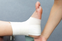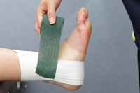 非伸縮テープを使います。テープを巻く土台となる部分で、外くるぶしからこぶし1つくらい上に2本巻きます。