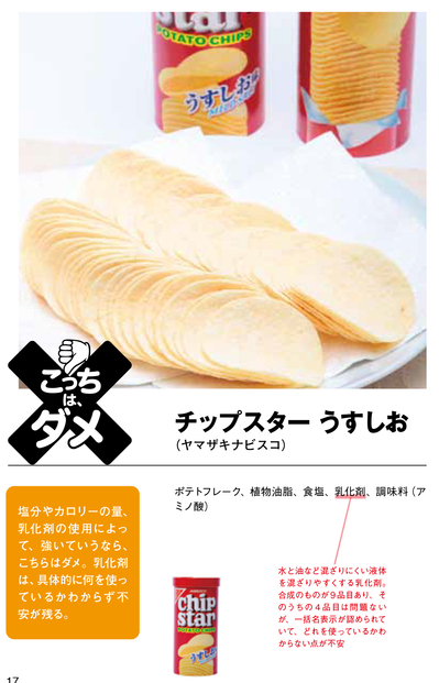 どれも揚げ油を使っているので、脂肪が酸化してできる過酸化脂質がふくまれています。これは有害性があり、多くふくまれると、腹痛や下痢を引き起こすことがあります。とくに油に敏感な人は、注意してください。また、調味料(アミノ酸等)は、Lーグルタミン酸Naをメインにしたもので、一度に多くとると、人によって、顔や肩、腕などに灼熱感を覚えたり、動悸を感じることがあるので、この点も注意してください。また、【チップスター うすしお味】にはほかに乳化剤が使われていますが、具体名がわからないので不安要素になっています。