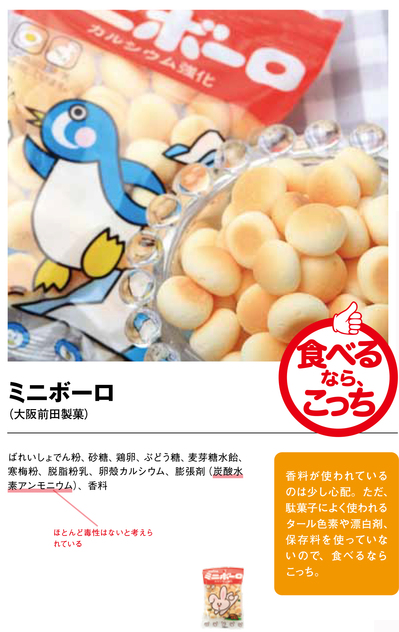 そんな中で、【ミニボーロ】は、ほかの3商品に比べればマシといえるでしょう。膨張剤の炭酸アンモニウムは、ほとんど毒性はないと考えられています。また、卵殻カルシウムは、卵の殻から抽出したもので、これも問題はありません。なお、「寒梅粉」とは、新米を粉にしたものです。