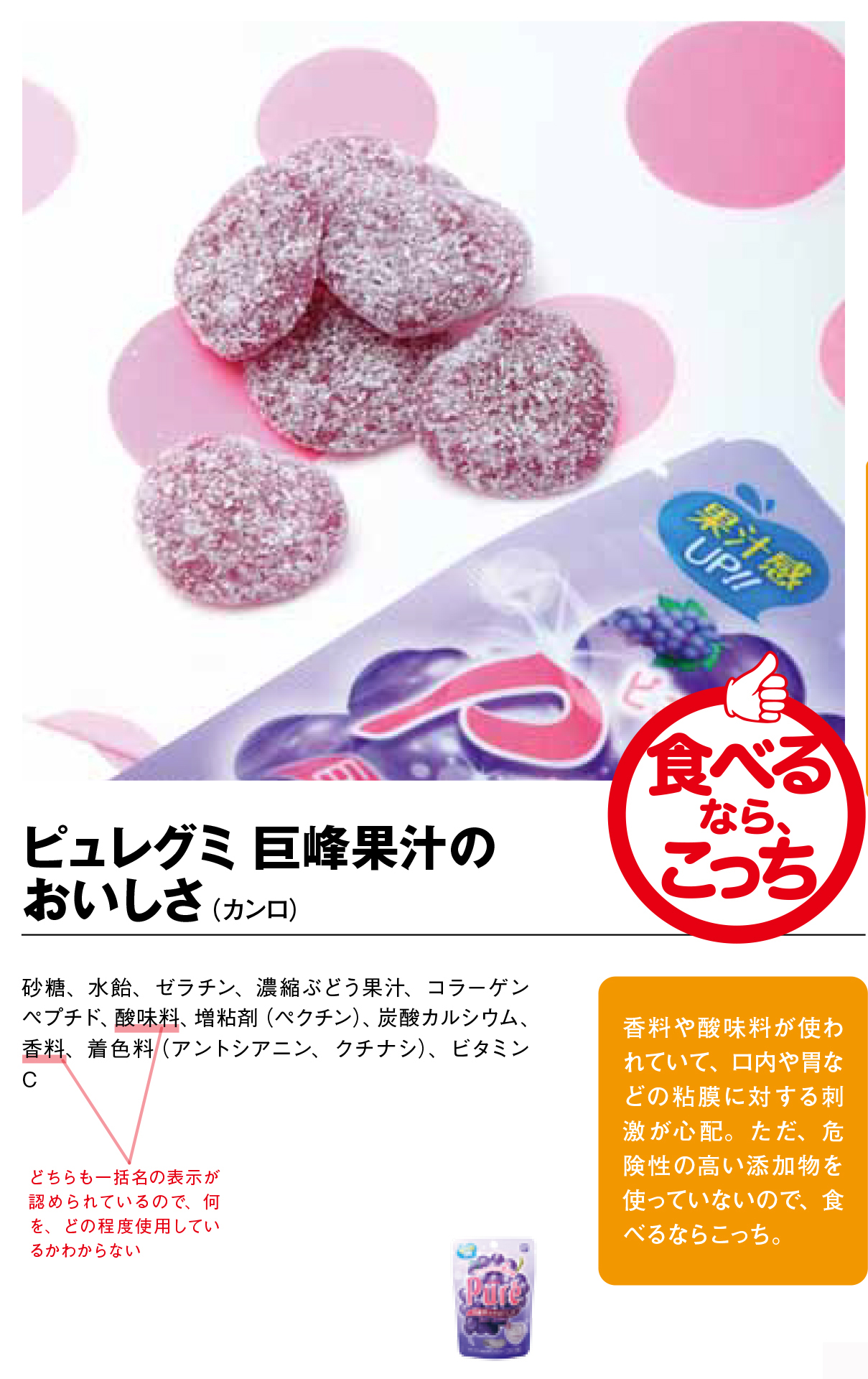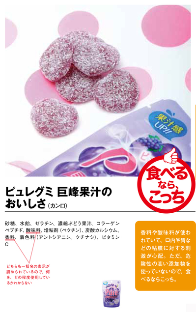 【ピュレグミ 巨峰果汁のおいしさ】にも、香料や酸味料が使われているので、口内や胃などの粘膜に対する刺激が心配されます。
