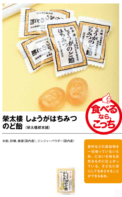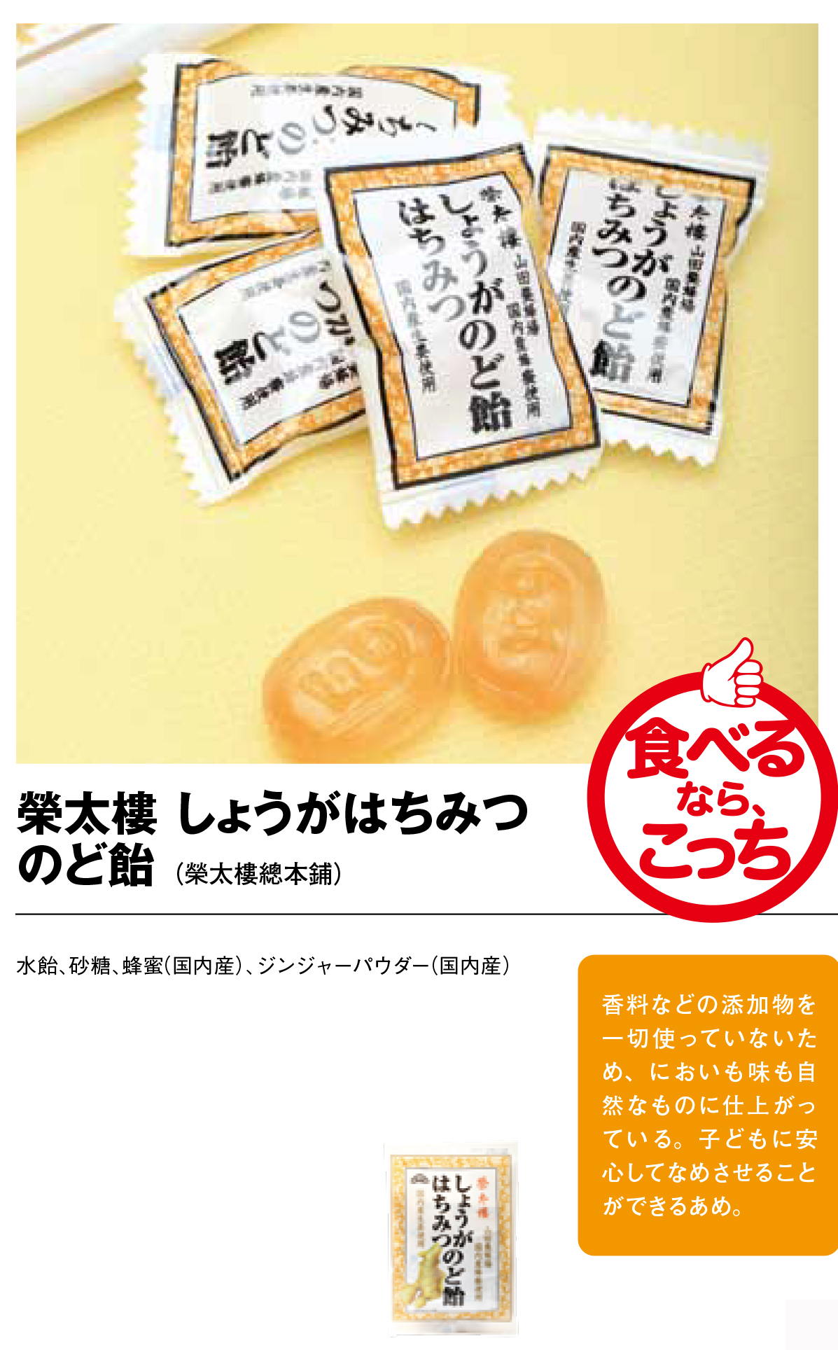 最近、のど飴が流行していて数多くの商品が出ていますが、とくにオススメしたいのは、【榮太樓 しょうがはちみつのど飴】です。香料などの添加物をふくんでいませんので、人工的で刺激的なにおいがありません。味もショウガの効いた自然なもので、のどをやさしくうるおしてくれます。これならば、お子さんにも安心してなめさせることができます。