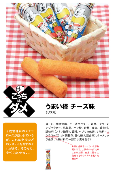 【うまい棒 チーズ】は、1本10円という低価格によって受けていますが、安全性の疑わしい合成甘味料のスクラロースが使われているので、食べない方がいいでしょう。