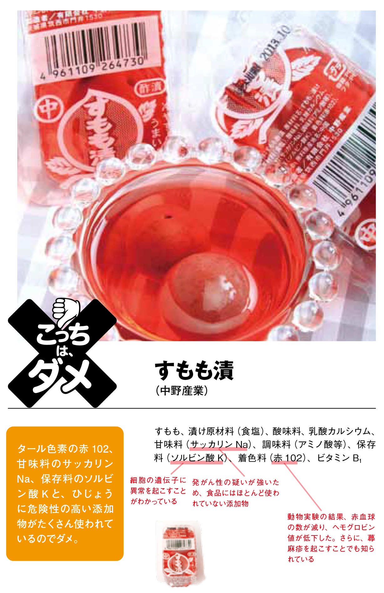 【すもも漬】には、赤102(赤色102号)が使われています。赤色102号を2%ふくむエサをラットに90日間食べさせた実験では、赤血球の数が減り、ヘモグロビン値が低下しました。蕁麻疹を起こす添加物としても知られています。さらに、この商品には、合成甘味料のサッカリンNaが使われていて、これにはビックリしました。サッカリンNaは、発がん性の疑いが強いため、食品にはほとんど使われていないからです。そのうえ、合成保存料のソルビン酸K も使われています。ソルビン酸K は、細胞の遺伝子に異常を起こすことがわかっています。
