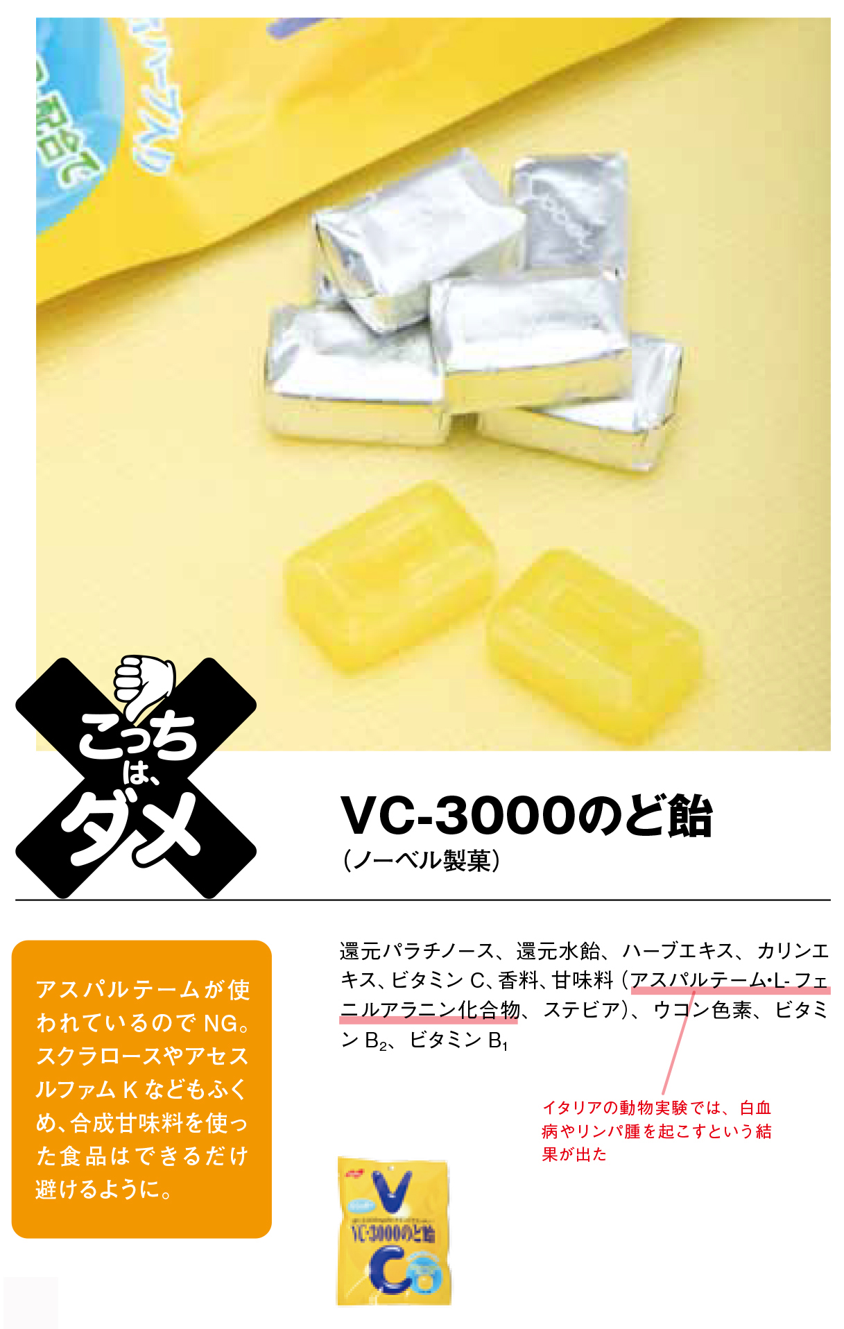 【VC-3000 のど飴】は、歌手の天童よしみさんのテレビCM で知られる商品ですが、合成甘味料のアスパルテームが使われています。イタリアの動物実験では、白血病やリンパ腫を起こすという結果が出ているので、できるだけ避けた方がいいでしょう。