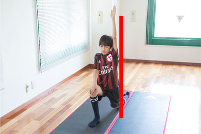 立った状態から片足を前に出します。背筋を伸ばすことを意識しながら、前へ体重をかけていき、ふとももの付け根が伸びてきたら左手を上に伸ばします。この姿勢を20秒間ほど維持してください。