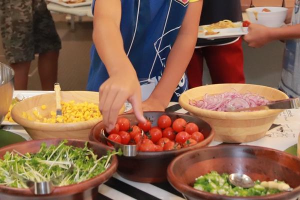 練習後なるべく早い栄養補給を心がけております。また水分補給だけでなくサカイクキャンプでは「熱中症対策には食事も大切だよ」と伝えています。トレーナーやコーチたちが体重が2%以上減少した子を把握することで食事の指導、水分補給を積極的に促し、熱中症を予防します。電解質(イオン)が含まれた清涼飲料水のほか、経口補水液なども用意しております。