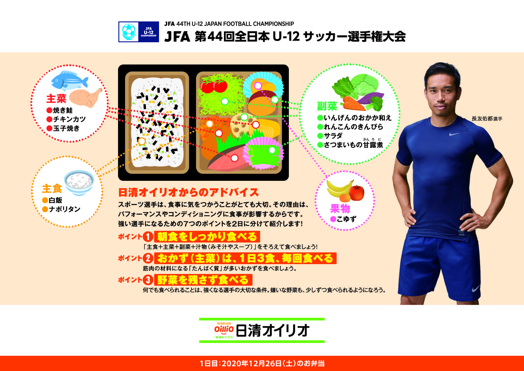 U-12大会出場チームでの取り組みや、日清オイリオが日本サッカー協会と協力して制作し、大会でも配布した「親子で楽しむ! 食生活サポートBOOK」を参考に、普段の食事や、試合前日、当日の食事作りに役立ててください。