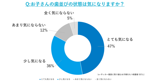 サッカーに取り組むお子様の保護者(サカイクユーザー)537名を対象に、子供の歯並びと歯列矯正に関する意識調査を行ったところ、子供の歯並びを気にする保護者が約80%、子供の歯列矯正を検討したことがある保護者が70%弱いることがわかりました。