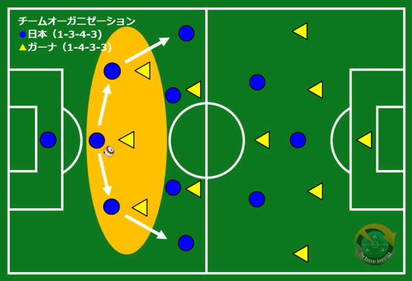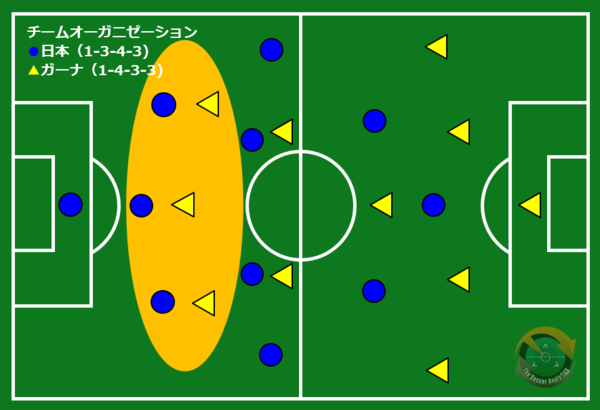 ガーナ戦のポイントの一つになったのが、1-3-4-3のチームオーガニゼーションです。チームオーガニゼーションは、選手の並びを表すだけでなく、相手チームとの噛み合わせを見る上でとても重要な要素と言えます。ガーナのチームオーガニゼーションは1-4-3-3ですから、日本の3人のDFは、ガーナのFW3人と数的同数になる局面が多発することが予想されます。