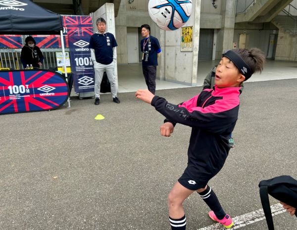 コート近くのアンブロブースでは、『プロテクトヘッドバンド』を着用した参加者が、10回連続でヘディングを成功させると、シューズケースなどがもらえるイベントが開催。